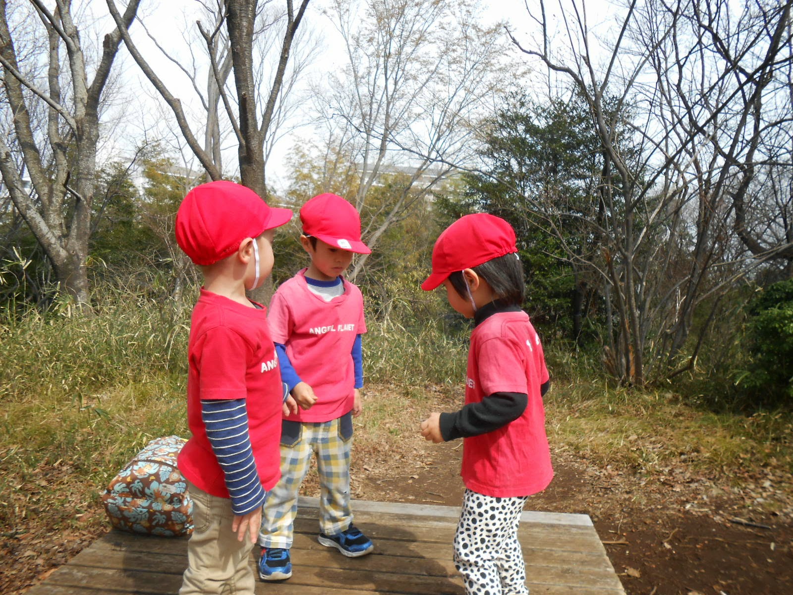 BB弾をひろったり、虫みたいな葉っぱを見つけて大騒ぎしたり、アリさんや桜の花を見つけて、もう春だね~、とお話ししたり、からす山の自然を満喫しました。