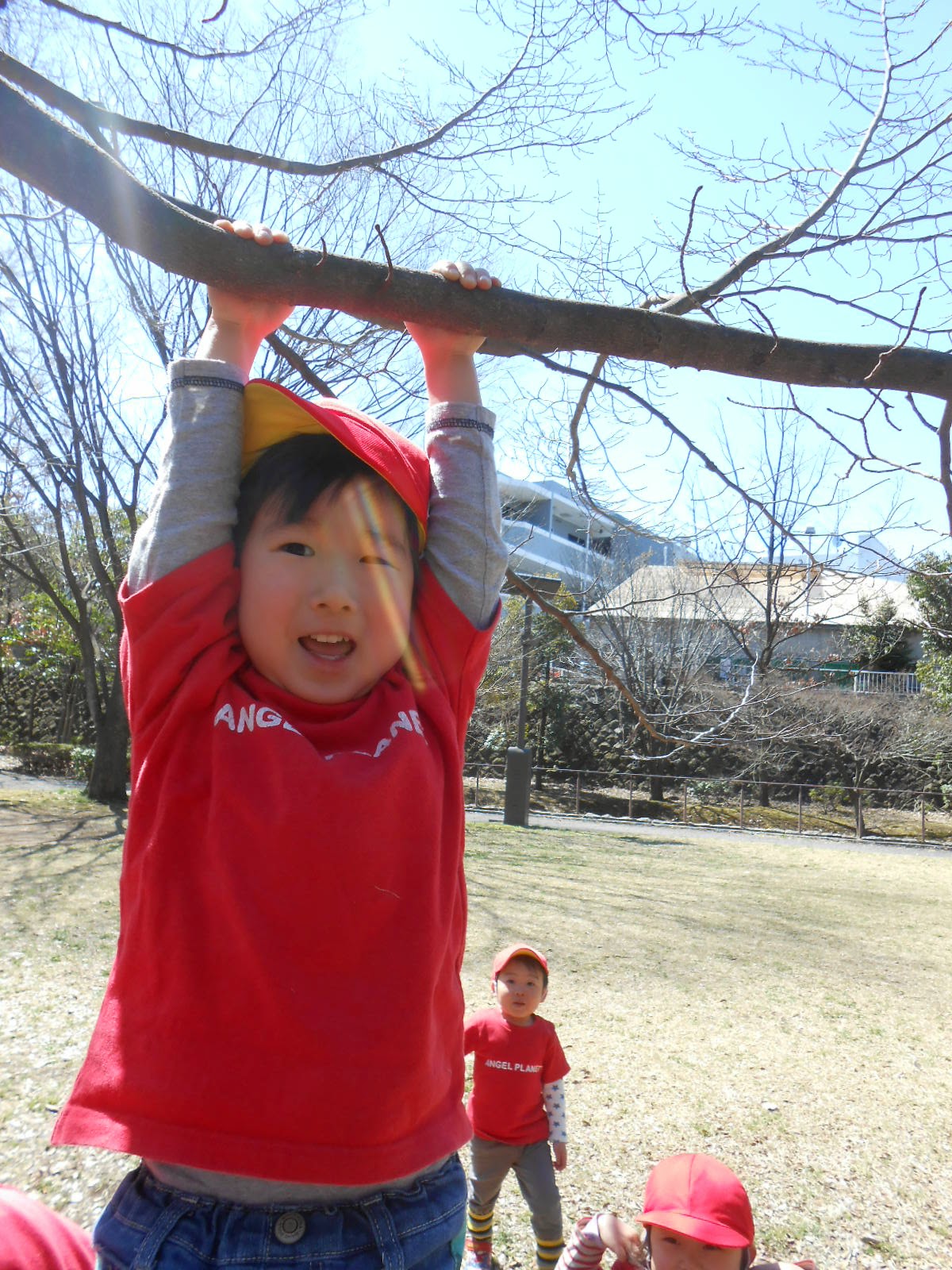お散歩は、原っぱ公園へ。走ったり、木にぶら下がったり、元気に体を動かしました。