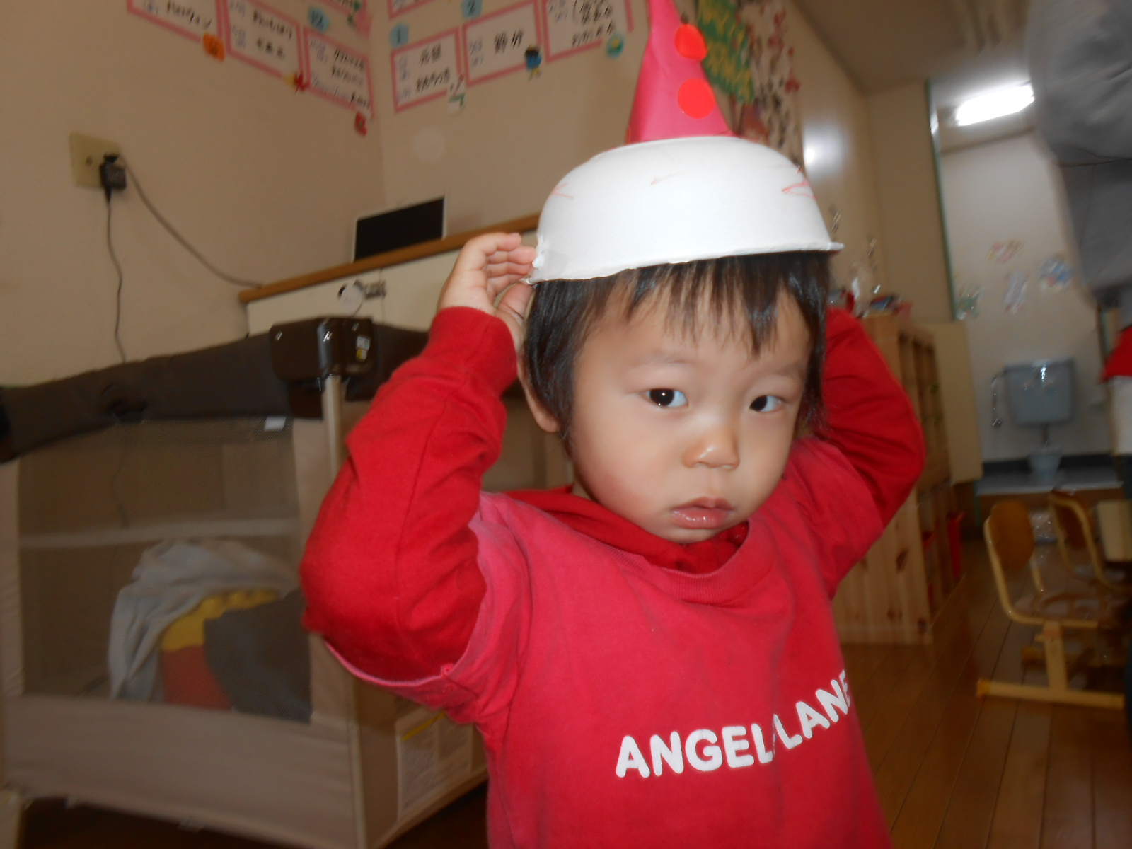 鬼はー外、福はー内!製作で作った鬼のお面と帽子をかぶり、みんなで紙を丸めて作った豆を、元気に投げました。最後には、やさしくなった鬼さんと一緒に記念撮影もしました。