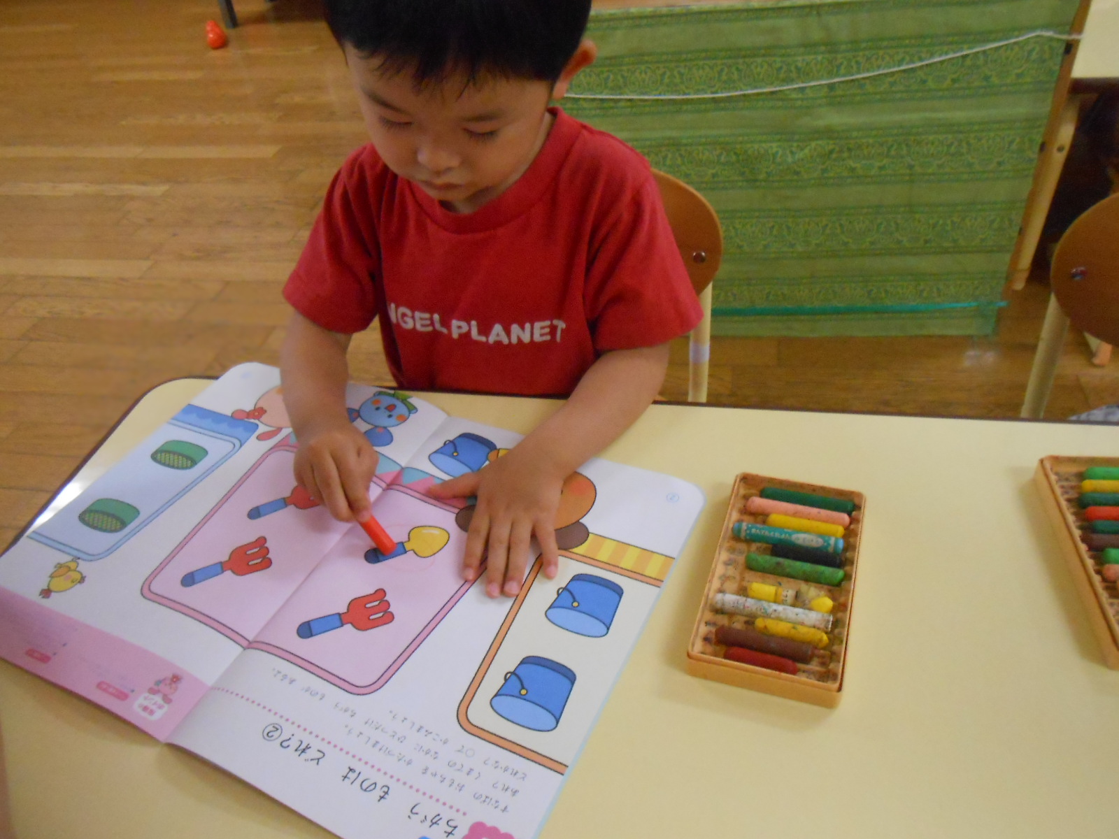 朝の活動は個別に用意してもらった知育ワークの使い方の練習をしました