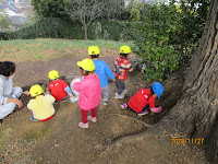 大きなどんぐりを見つけびっくりした表情を浮かべたり真っ赤なもみじの